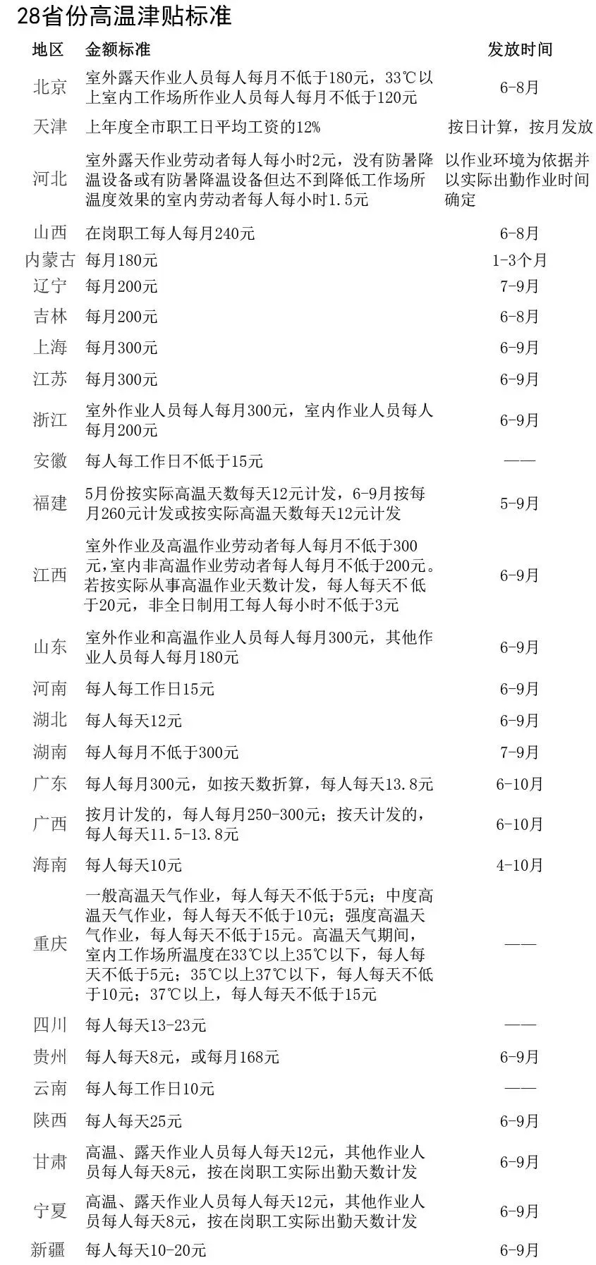 3、快來看看你所在省份的高溫津貼標準!