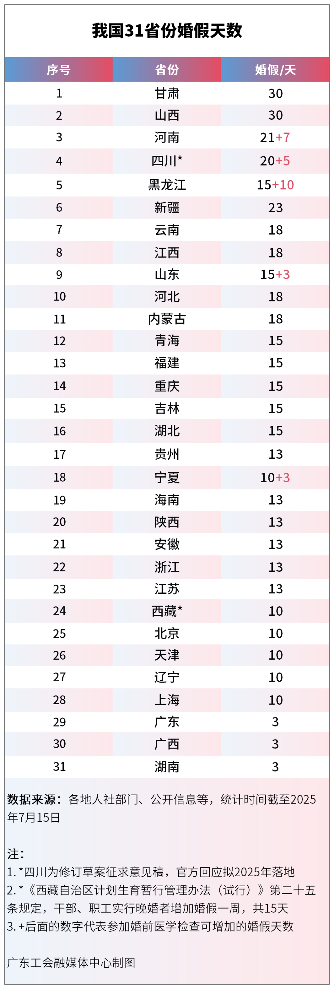 具體來看,甘肅、山西婚假達(dá)30天,是全國婚假最長的省份。