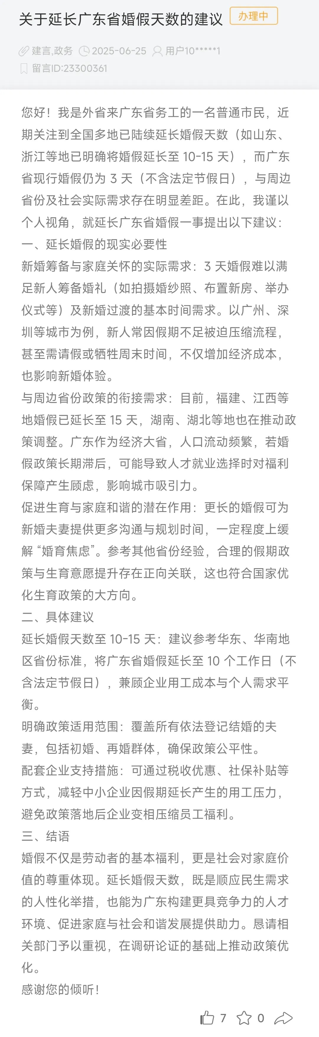 近日,有網(wǎng)友在人民網(wǎng)領(lǐng)導(dǎo)留言板上發(fā)帖建議廣東延長婚假至10-15天,并給出理由:3天婚假無法滿足新人籌備婚禮及過渡需求;更長婚假可緩解“婚育焦慮”,與生育意愿提升正相關(guān),符合國家政策方向;同時(shí)可配套稅收優(yōu)惠、社保補(bǔ)貼等減輕中小企業(yè)用工壓力。