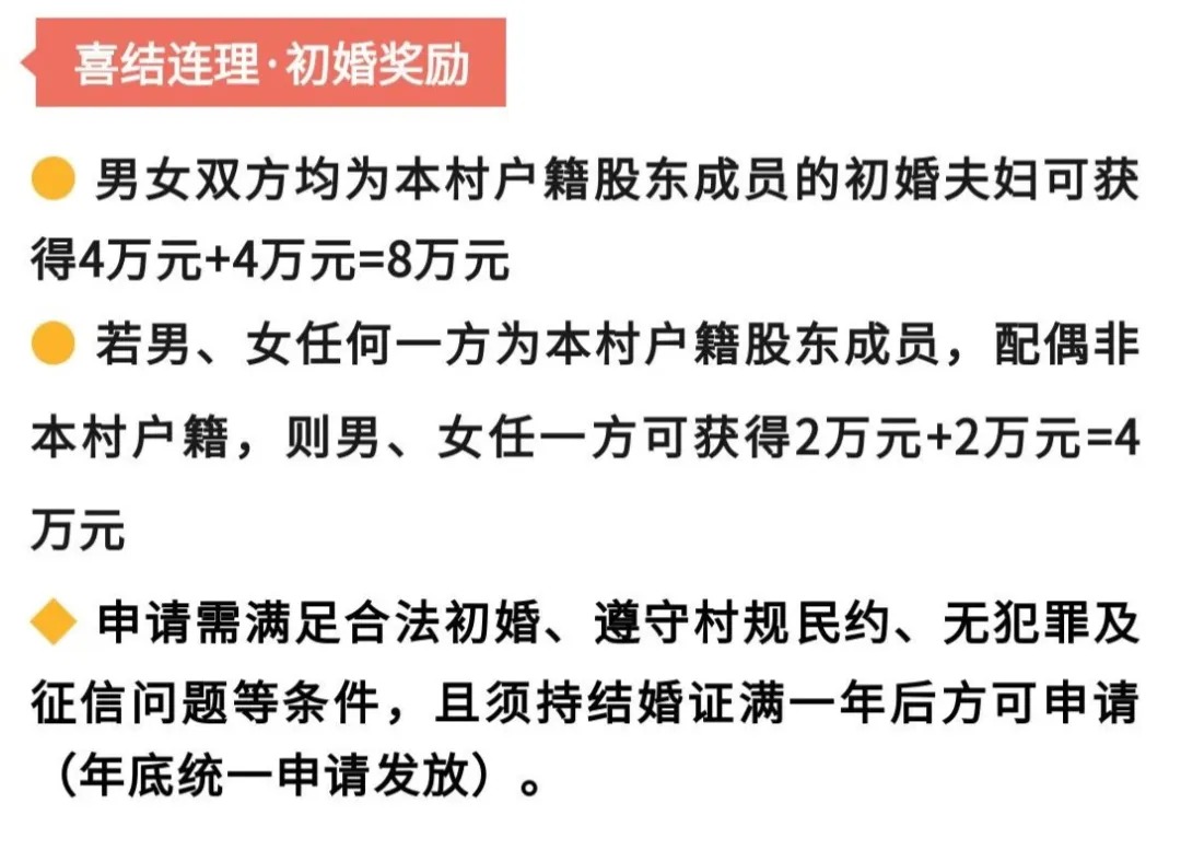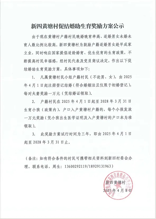 ● 今年5月,廣東省東莞市橫瀝鎮(zhèn)新四黃塘村公布婚育獎(jiǎng)勵(lì)方案,符合婚姻法且僅限于初婚登記,可獲一萬元獎(jiǎng)勵(lì)。