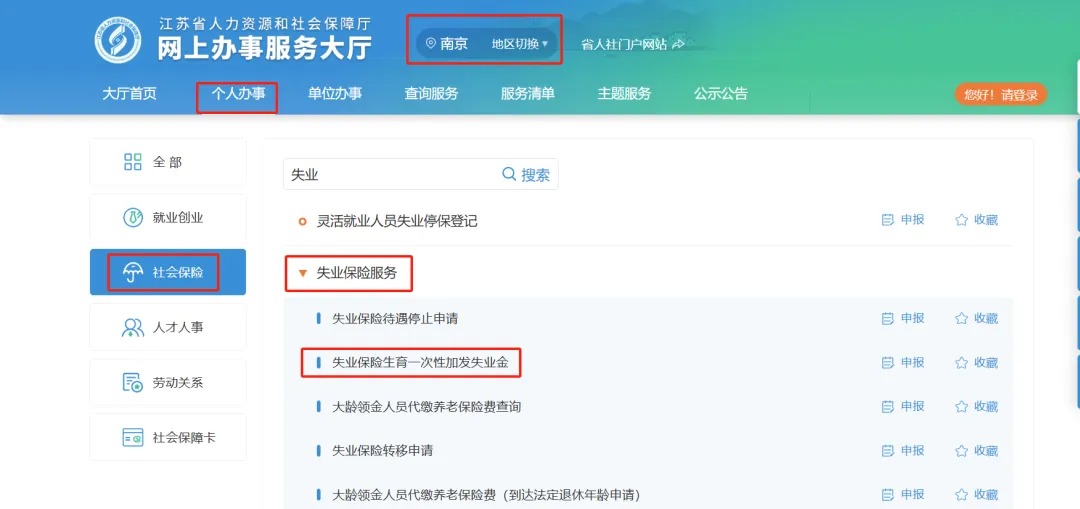 二、登錄江蘇省人力資源和社會(huì)保障廳網(wǎng)上辦事服務(wù)大廳(https://rs.jshrss.jiangsu.gov.cn/index/),完成登錄后,在“個(gè)人辦事—社會(huì)保險(xiǎn)—失業(yè)保險(xiǎn)服務(wù)—失業(yè)保險(xiǎn)生育一次性加發(fā)失業(yè)金”模塊,提交辦件材料后提交申請(qǐng)。