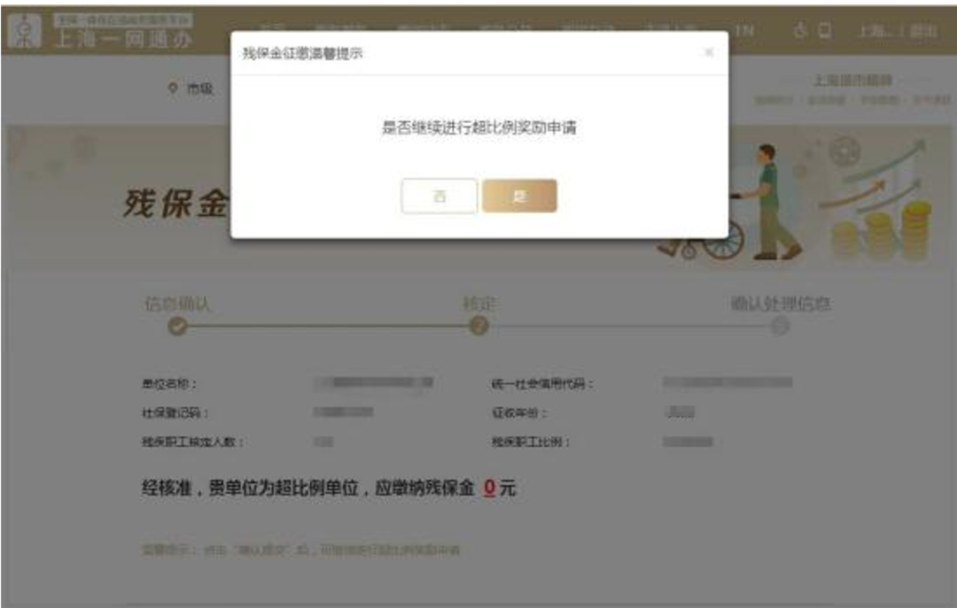 3、超比例獎(jiǎng)勵(lì)單位無需繳納殘保金,在應(yīng)繳納殘保金為0元的頁面點(diǎn)擊“確認(rèn)提交”后,根據(jù)提示選擇是否繼續(xù)進(jìn)行超比例獎(jiǎng)勵(lì)申請。