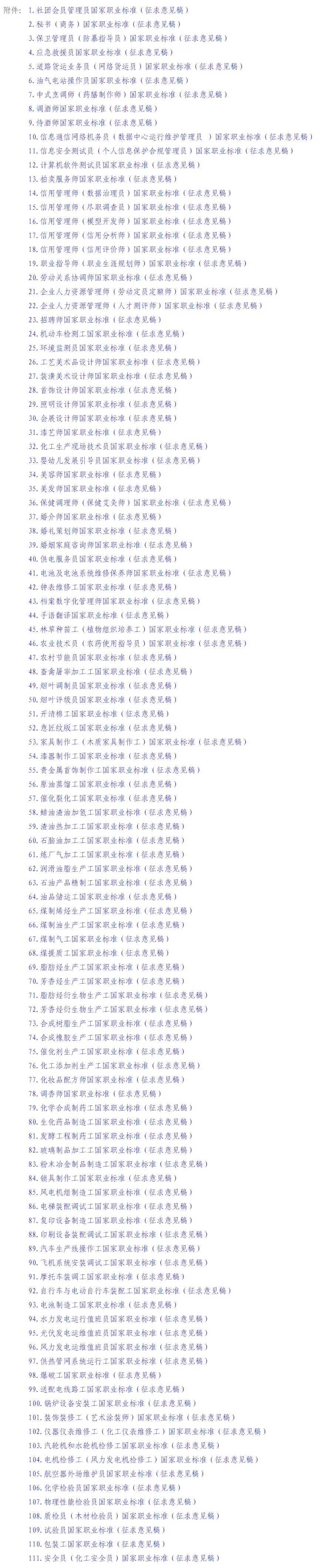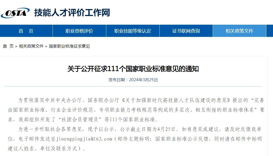 為貫徹落實中共中央辦公廳、國務院辦公廳《關(guān)于加強新時代高技能人才隊伍建設的意見》提出的“完善由國家職業(yè)標準、行業(yè)企業(yè)評價規(guī)范、專項職業(yè)能力考核規(guī)范等構(gòu)成的多層次、相互銜接的職業(yè)標準體系”要求,近期,人力資源社會保障部組織開發(fā)了“社團會員管理員”等111個國家職業(yè)標準。為進一步聽取社會各界意見建議,現(xiàn)在技能人才評價工作網(wǎng)公示征求意見,公示截止日期為4月25日。如有意見或建議,請按公示要求及時反饋。