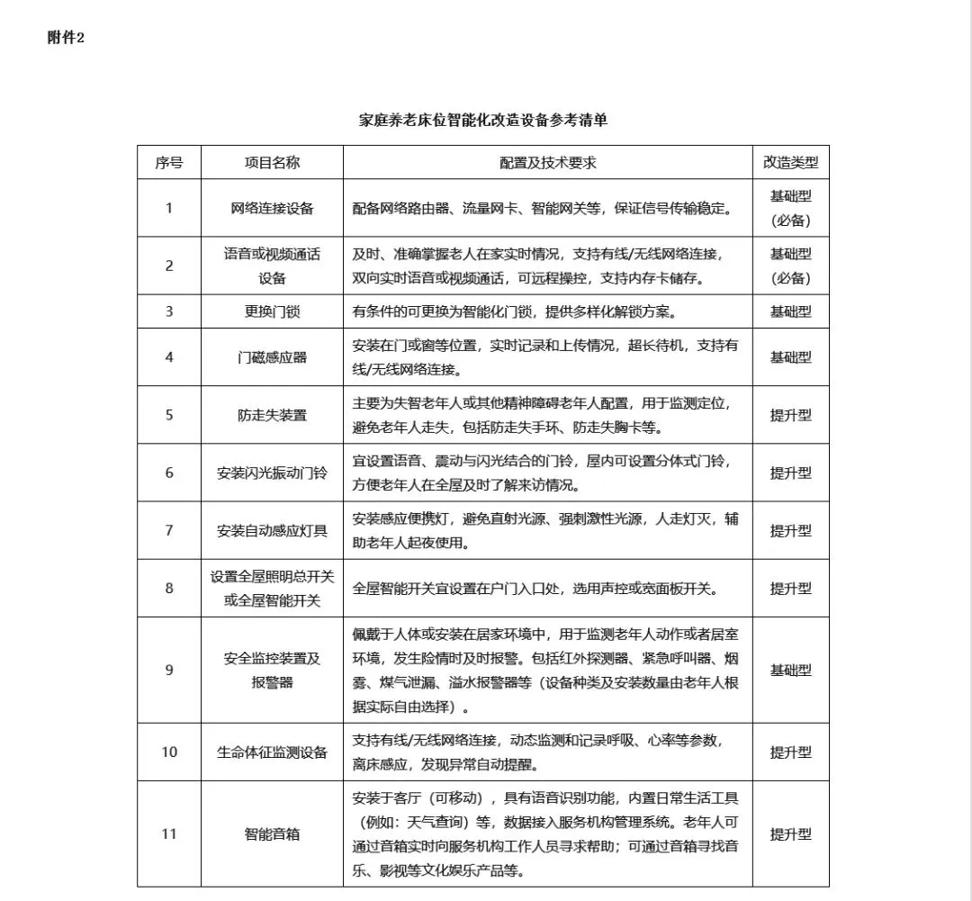 家庭養(yǎng)老床位智能化改造設(shè)備參考清單