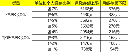 補(bǔ)充住房公積金繳存比例為各5%的,對(duì)應(yīng)的補(bǔ)充住房公積金月繳存額上限為3692元。